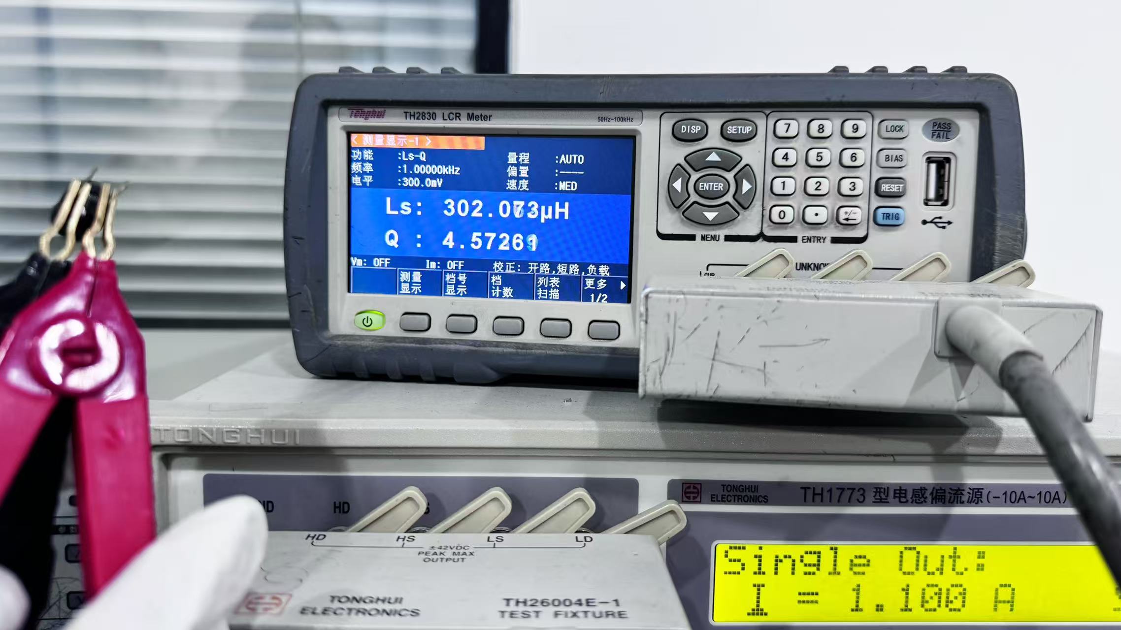 在樣品交付前,谷景已對該電感進行了全面性能檢測:阻值穩(wěn)定在 0.398-0.405Ω 之間,感值控制在 300.6-306.7uH 范圍,完全符合 ±10% 的誤差要求;電流承載性能上,1.1A 電流下感值變化率僅 11.5%,1A 電流下溫升 32.2℃且感值變化率 9.5%,各項指標(biāo)均滿足客戶 0.7A 的電流使用需求。此外,電感采用長腳設(shè)計,0.65mm 的引腳直徑與 5mm 的腳距,也完美匹配客戶電路板的安裝規(guī)格。